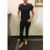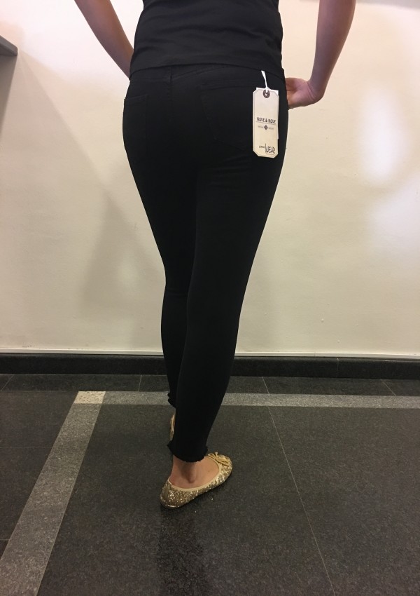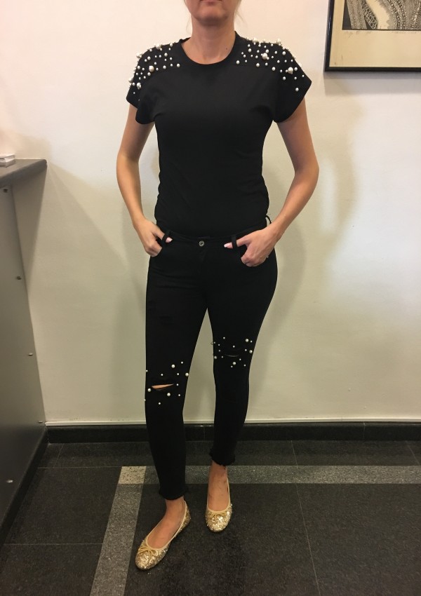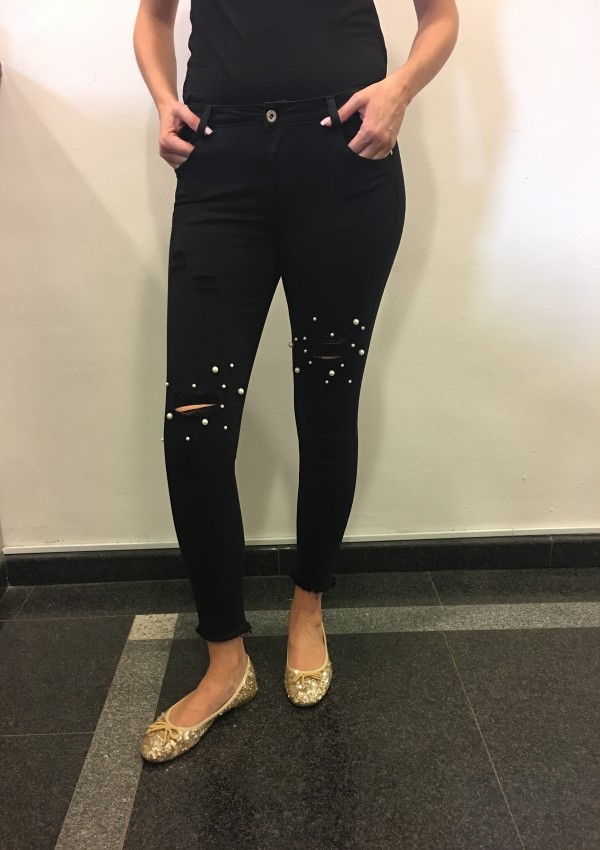 Črne oprijete hlače, ki so na kolenih strgane in imajo okrasne perlice.