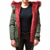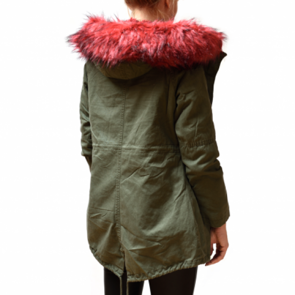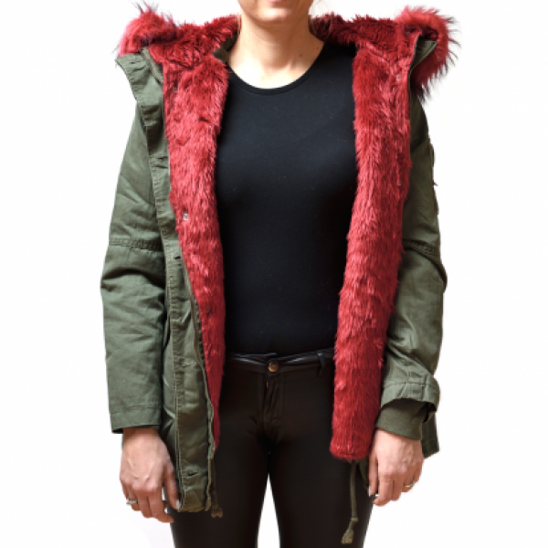 Vojaško zelena jakna v vojaškem stilu z toplo podlogo brezrokavnik, ki se sname iz tople muce rdeče barve in košatim ovratnikom na kapuci iz umetnega krzna. Jakno se lahko nosi v prehodnem obdobju ali pozimi, saj je notranji brezrokavnik in obroba na kapuci snemljiva.