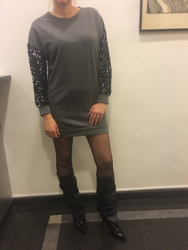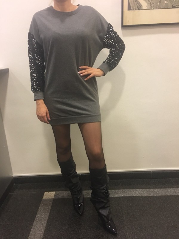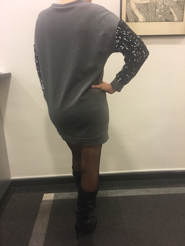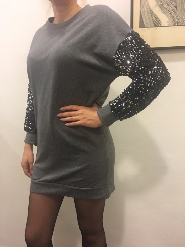 Širok pulover, ki se lahko nosi tudi kot tunika ali obleka z bleščicami na rokavih.