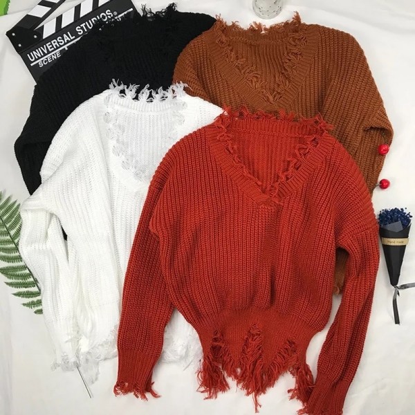 Kratek širok pulover z izrezom na V, ki je ob robovih scefran.