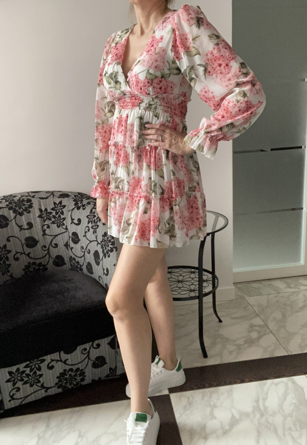 Čudovita jasenska oblekca z volančki in vzorcem rož, ki jo lahko kombinirate na bež jakno izgled usnja in bo pravi wauuuu outfit.